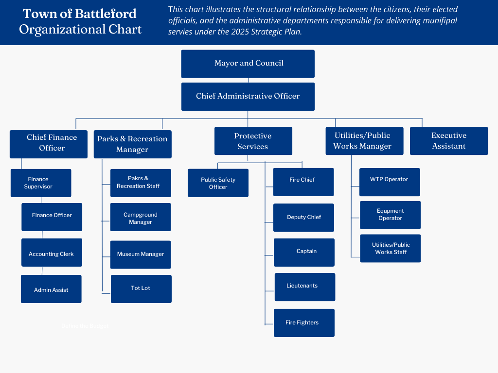 The following chart outlines the reporting structure from the citizens of Battleford through to our front-line service departments.