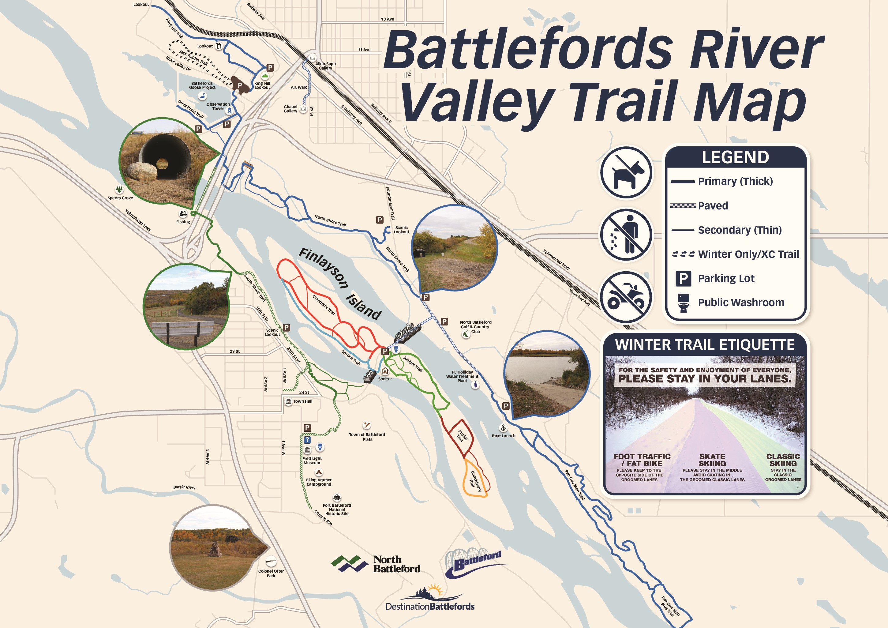 See map below of the trail system in Town of Battleford and Finlayson Island.
