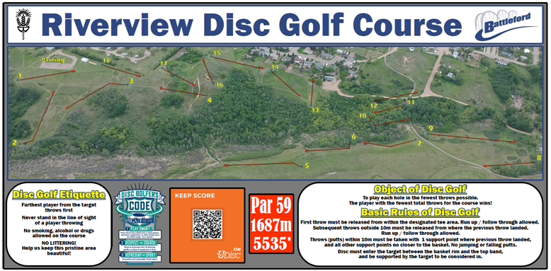 The Town of Battleford operates a permanent disc golf course. Much like regular golf, players work through a 9-hole or 18-hole course. Starting at the T-off point, players try to toss their disc into the basket at the end of each hole in the fewest number of throws.